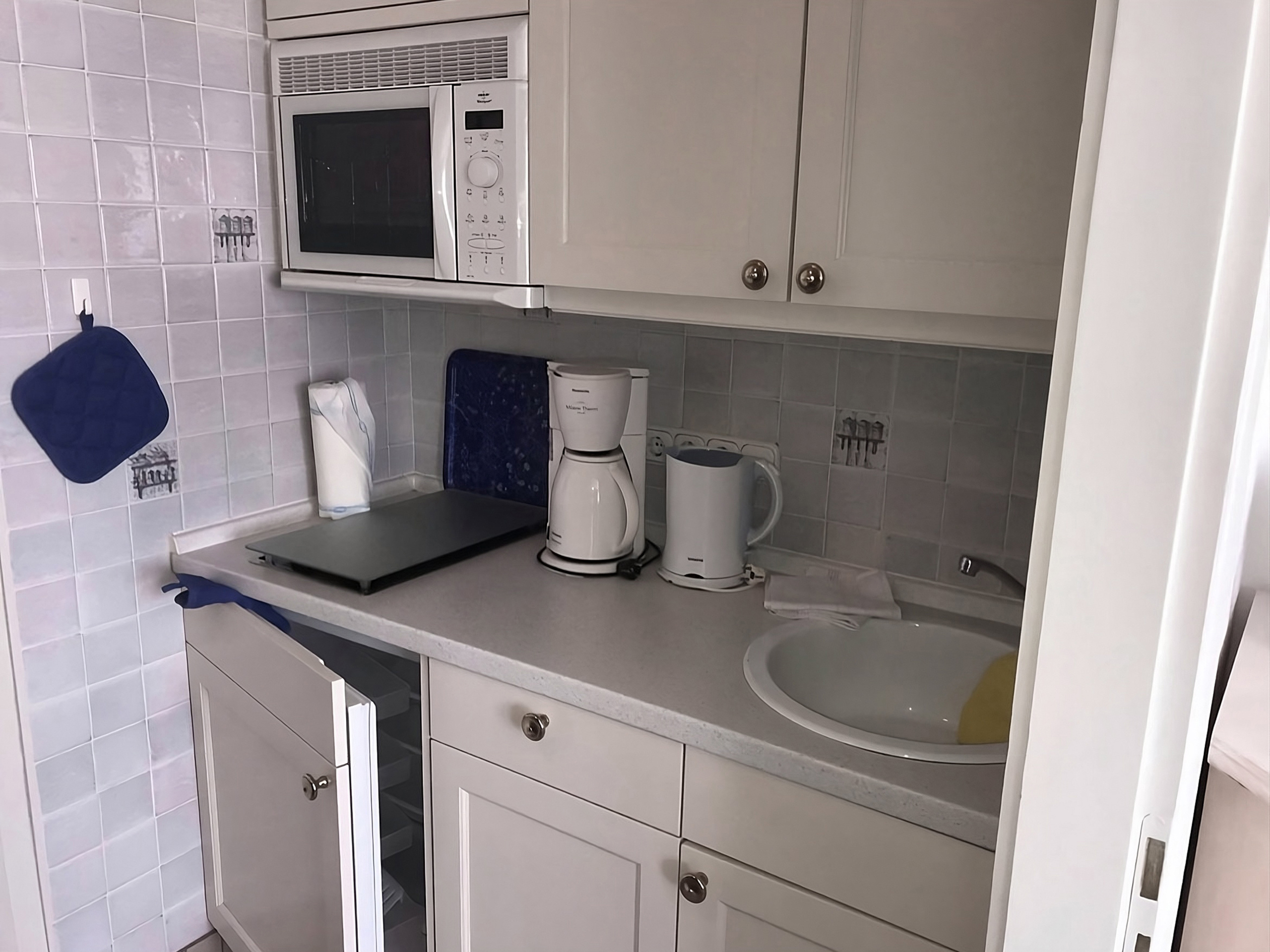 In der modernen Küche ist alles da, was man braucht, um sich etwas Leckeres zu zaubern – vom Cerankochfeld über Spülmaschine bis zur Mikrowelle. Frischen Fisch vom Markt, ein Glas Weißwein dazu – und schon ist das kleine Abendglück perfekt.
