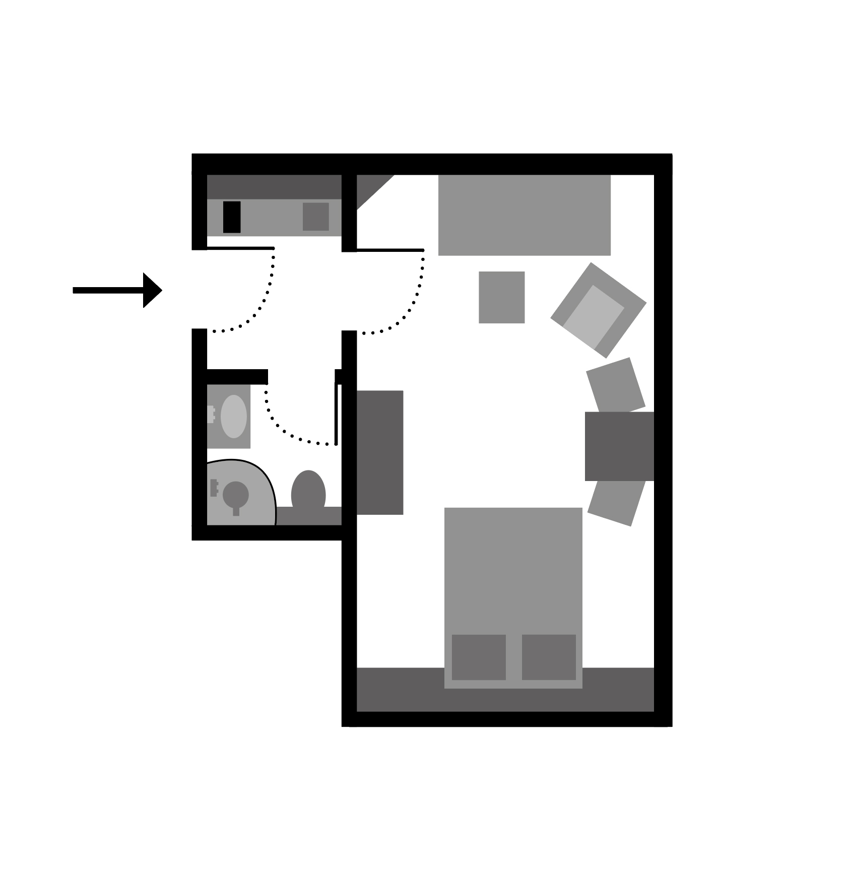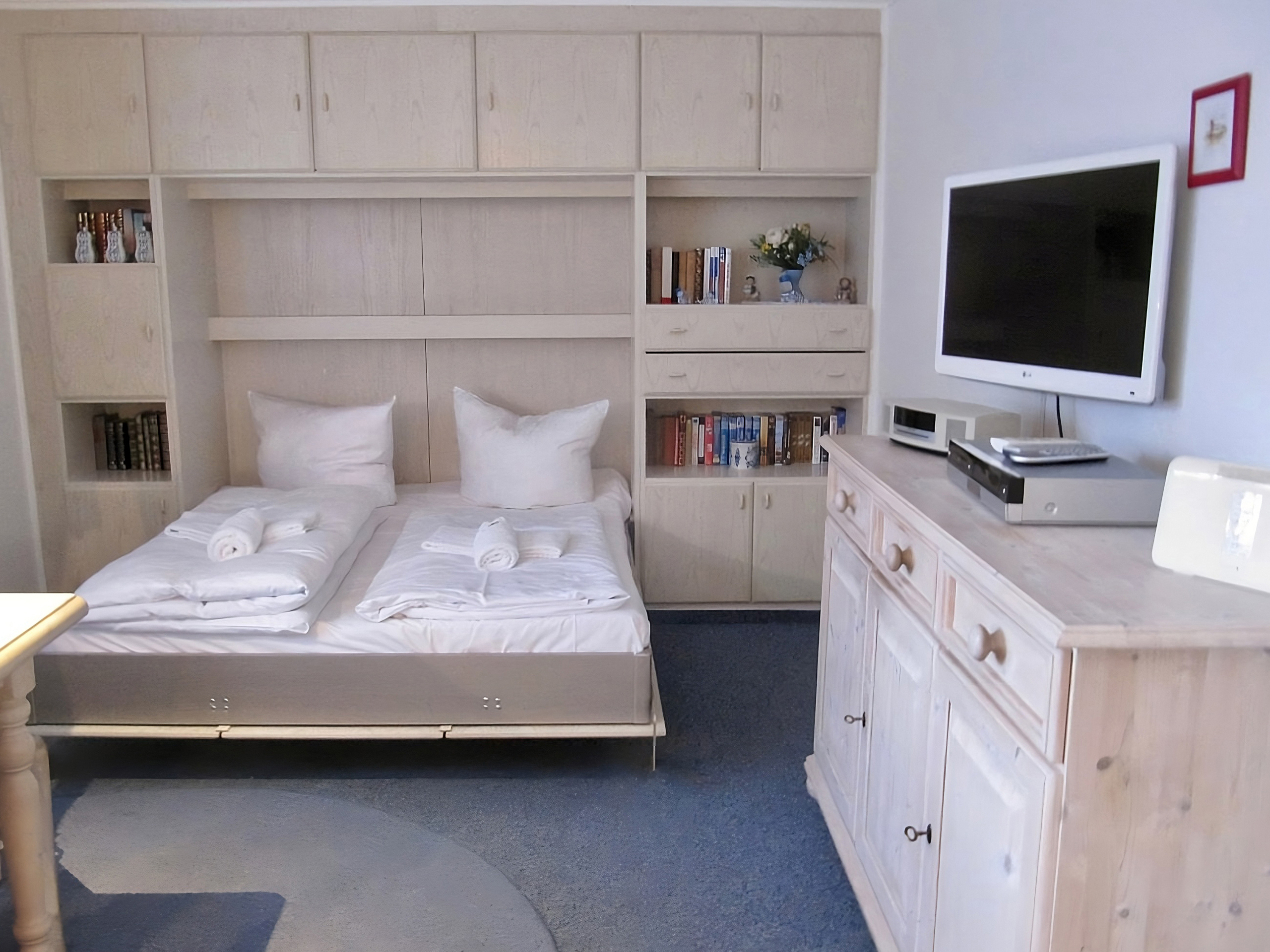 Das Appartement ist mit seinen 27 m² zwar kompakt, aber rundum behaglich und perfekt durchdacht. Der kombinierte Wohn- und Schlafbereich ist so clever gestaltet, dass er sich ganz Ihren Bedürfnissen anpasst. Tagsüber laden das bequeme Sofa und das warme Licht zum Entspannen ein – ideal für eine gute Tasse Tee nach einem Strandspaziergang oder einen gemütlichen Filmabend. Und wenn der Abend kommt, verwandelt sich der Raum im Handumdrehen in ein behagliches Schlafzimmer: Das komfortable Schrankbett lässt sich mit einem Handgriff ausklappen und bietet erholsamen Schlaf – so beginnt jeder Tag auf Sylt ganz entspannt.