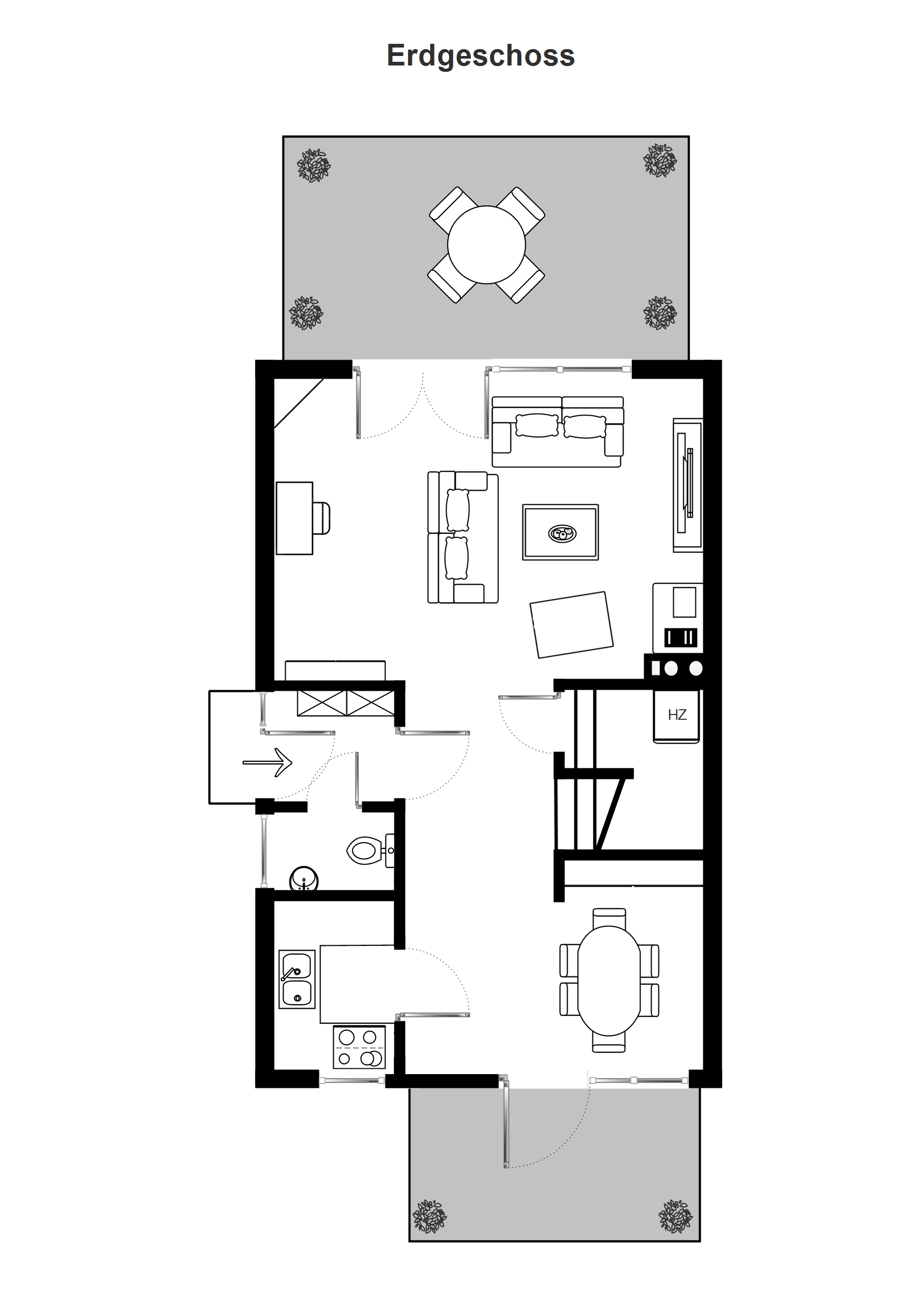 Im Erdgeschoss befindet sich ein heller Wohnbereich mit Zugang zur sonnigen Ostterrasse. Angrenzend liegt das Esszimmer mit Zugang zur Westterrasse, dazu eine separate Küche sowie ein Gäste-WC.